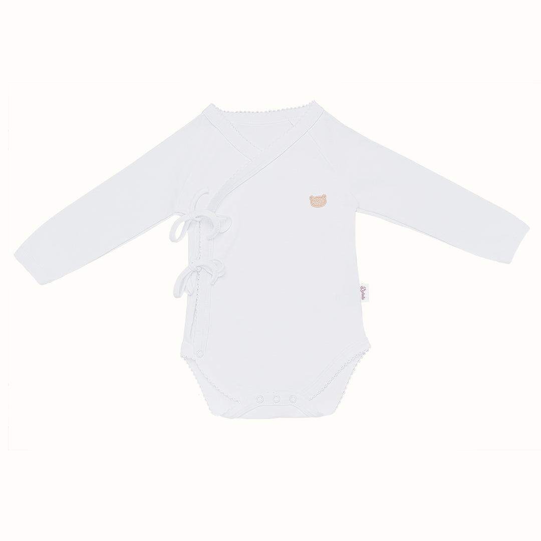 The wrap bodysuit with side tie closures, lace trim, and snap closure at the bottom.