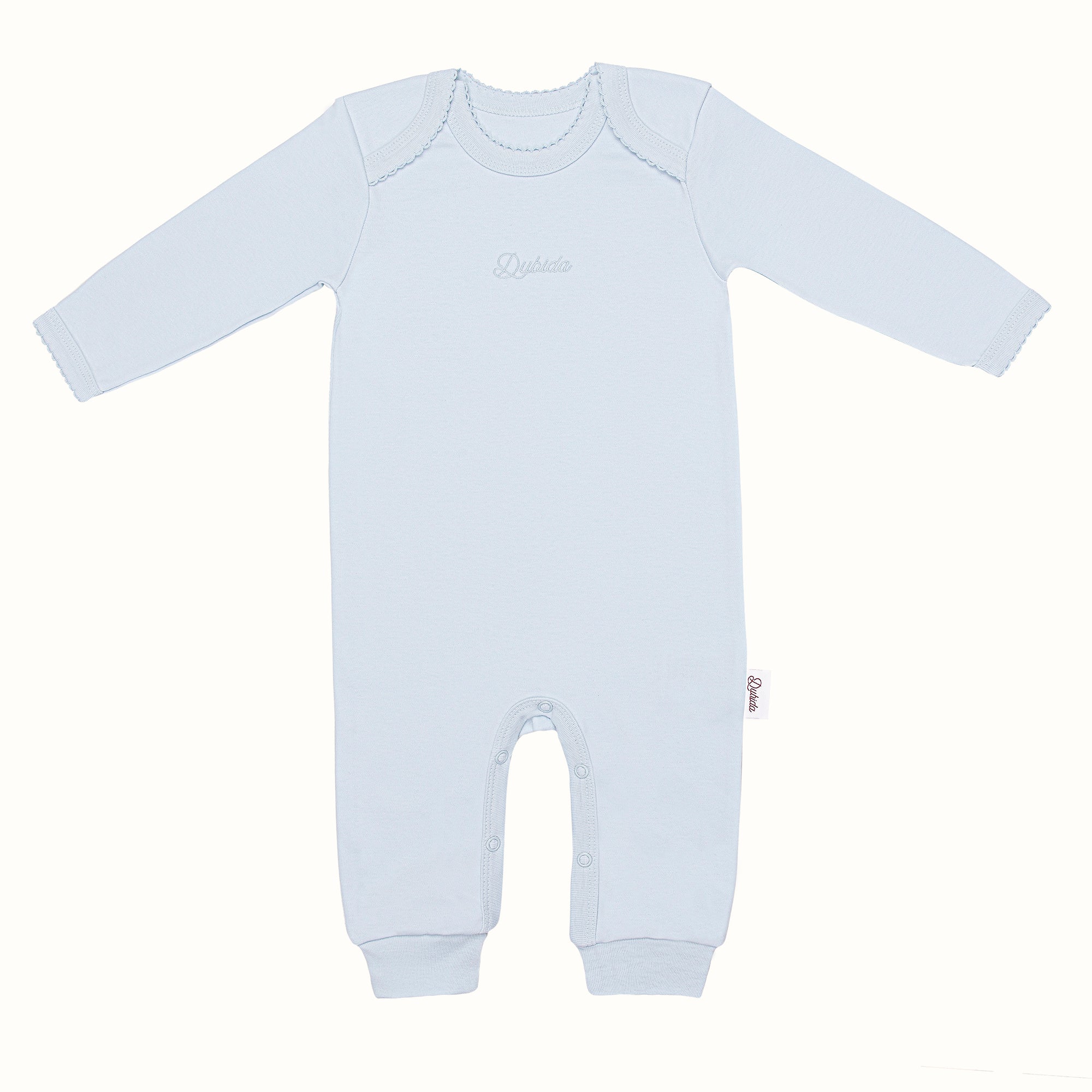 The long sleeve overall with an envelope neckline, ribbed cuffs, lace trim, and snap closure at the inseam.