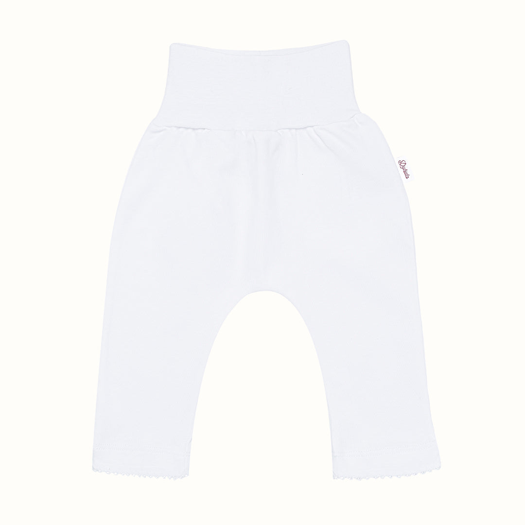 The pants with a wide waistband and subtle lace trim at the ankles.