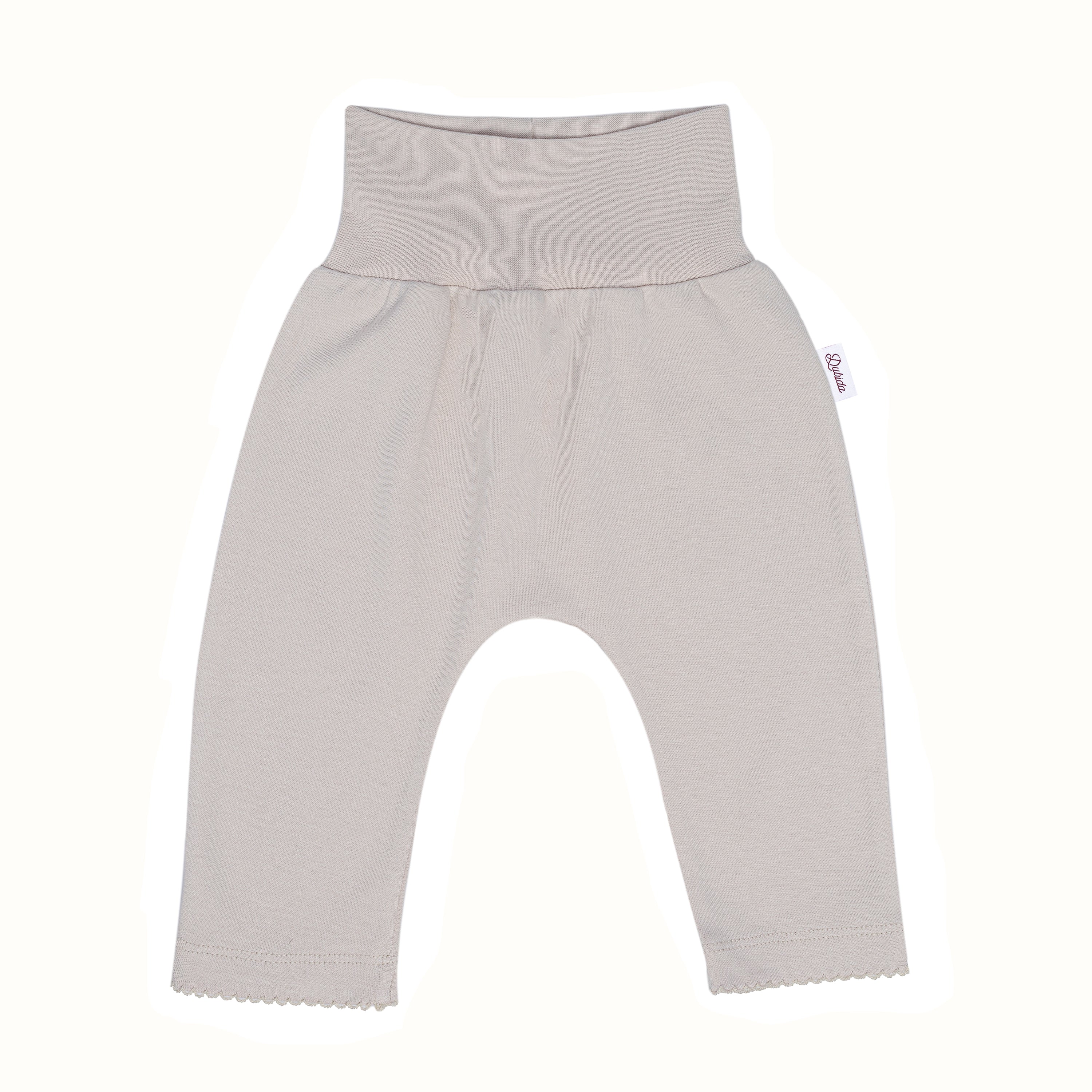 The pants with a wide waistband and subtle lace trim at the ankles.