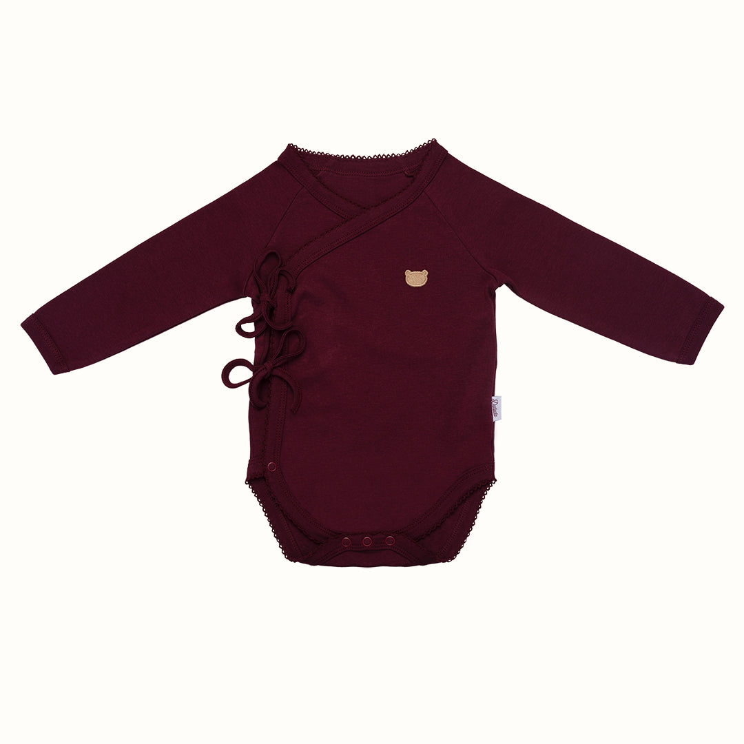 The wrap bodysuit with side tie closures, lace trim, and snap closure at the bottom.